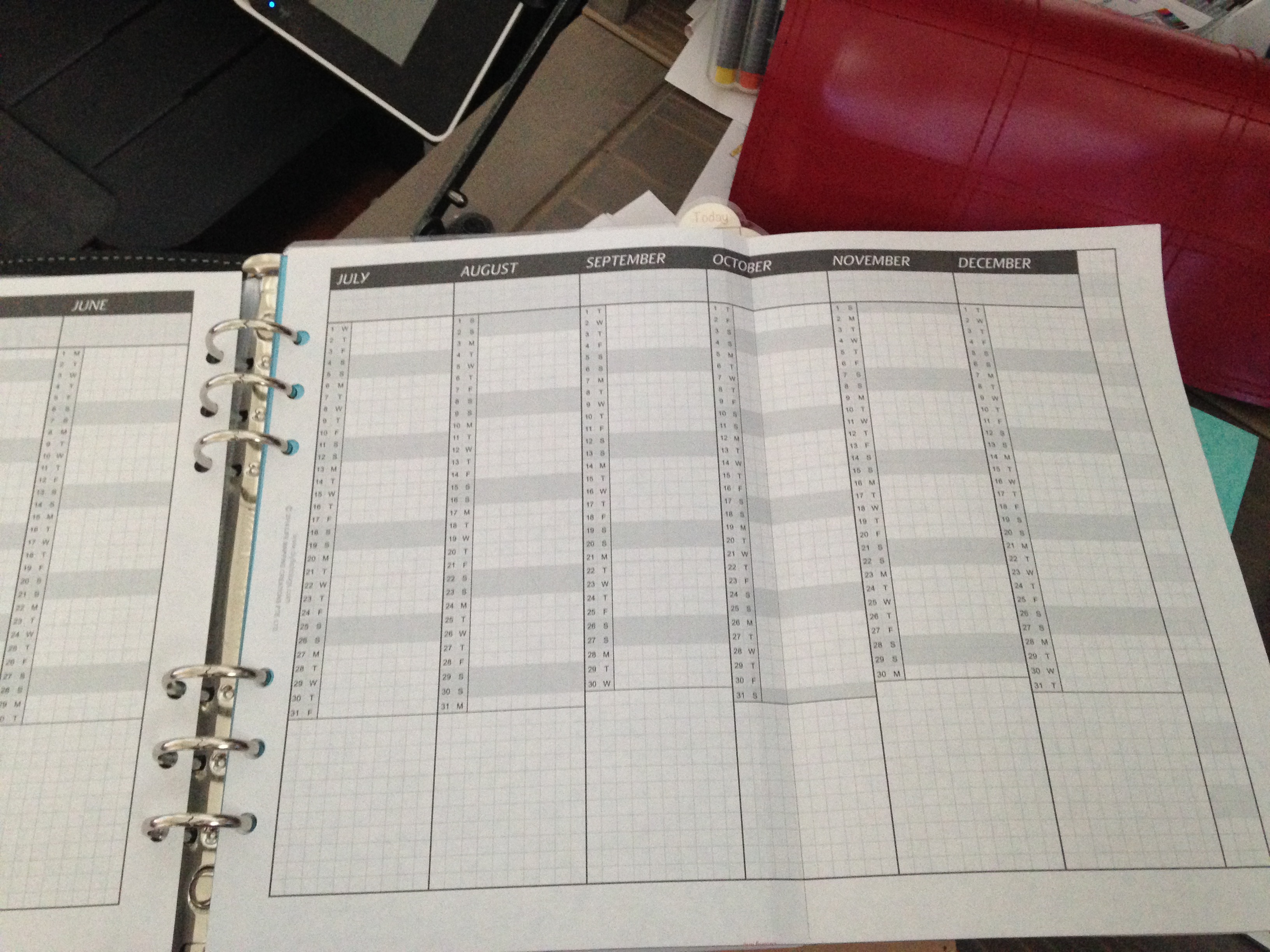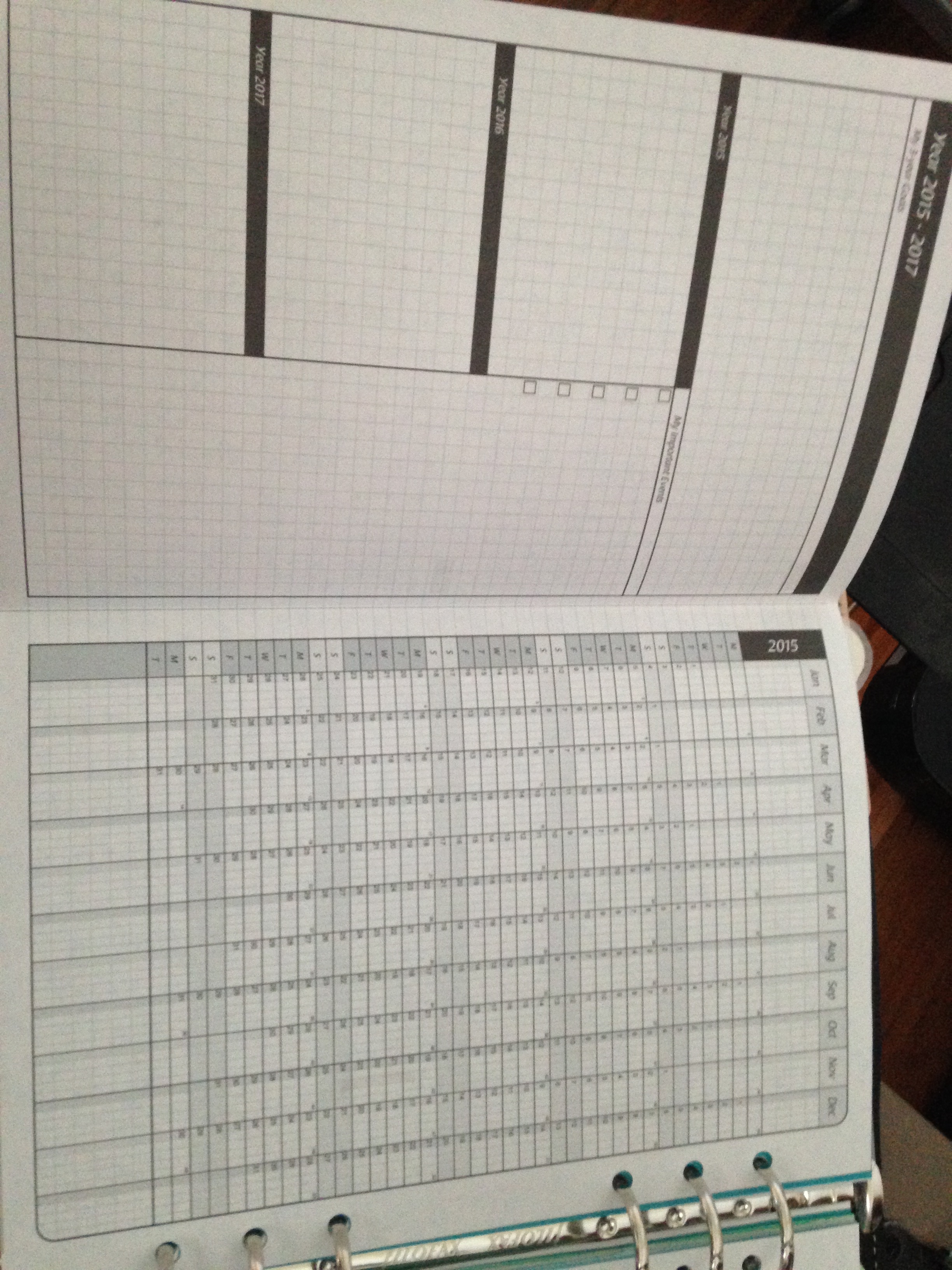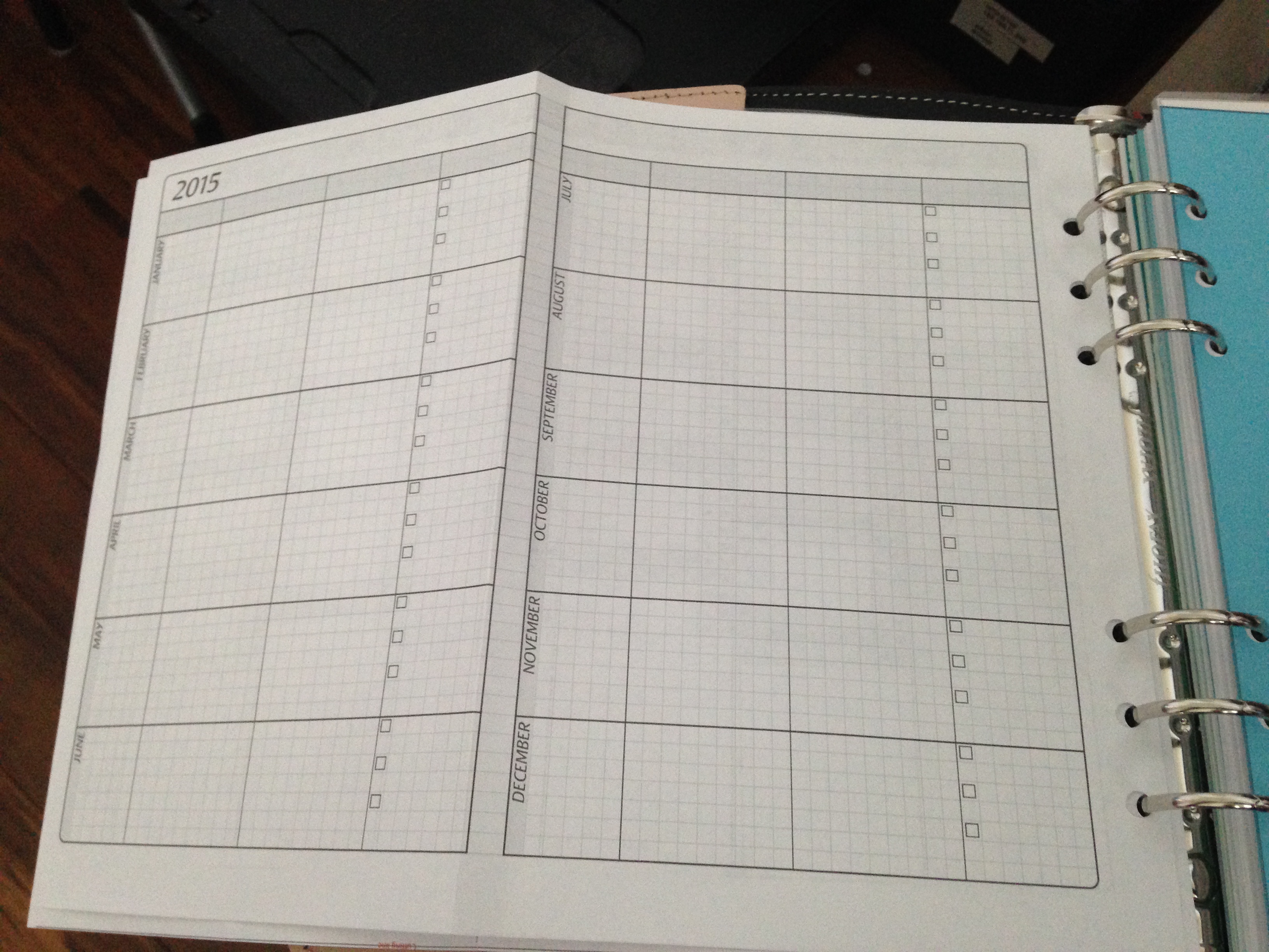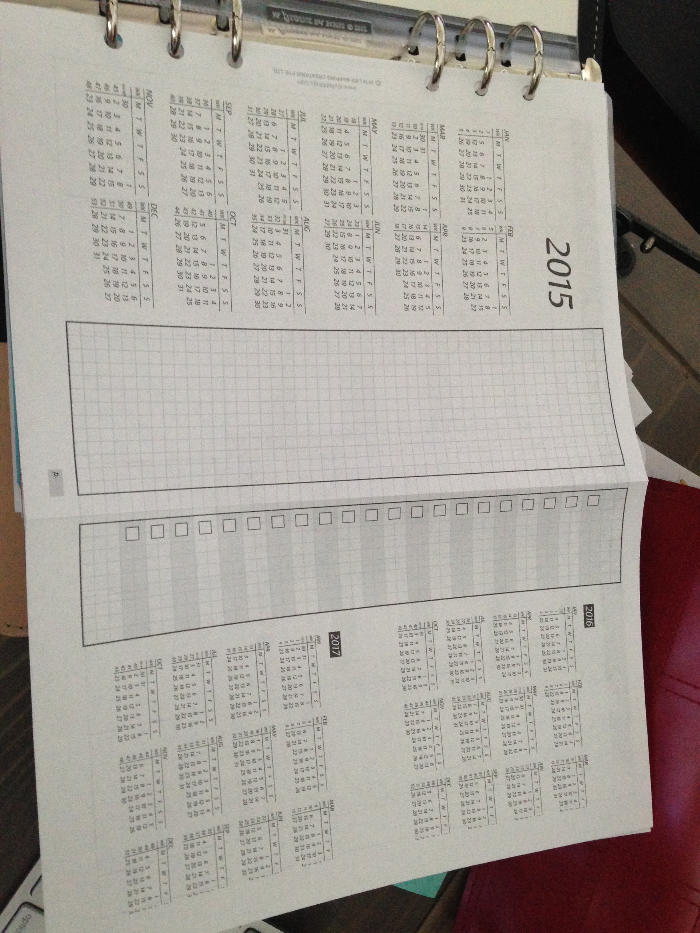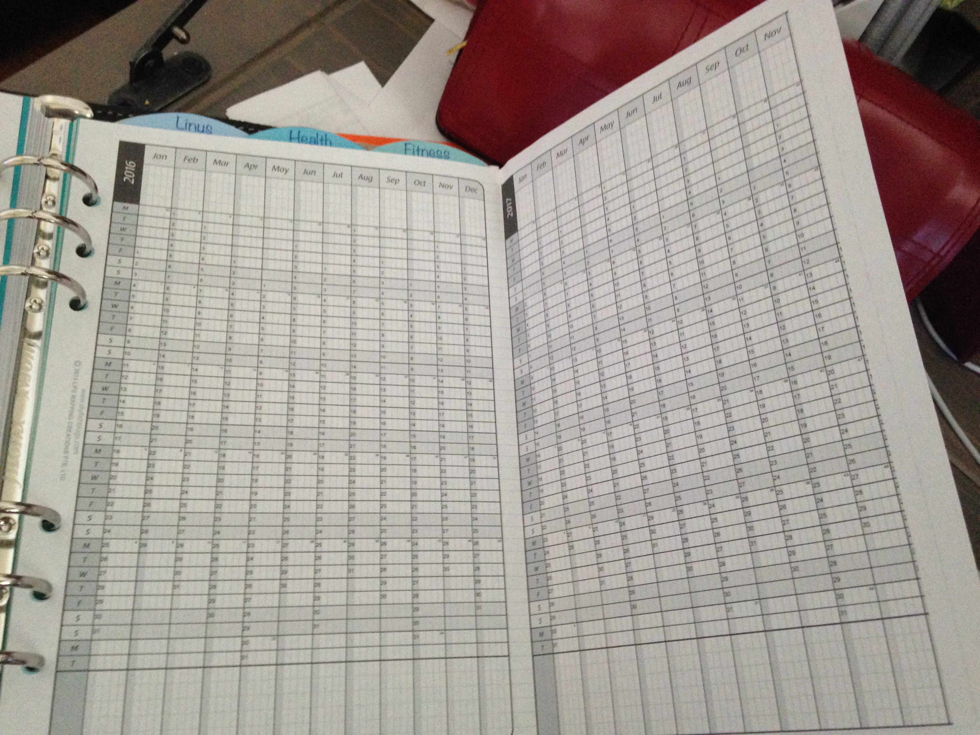 First I printed my yearly calendar and my 3 year planning calendar. My 1 year calendar is at the front of my binder to give me an overview of the rest of this year. The 3 year planning calendar is in the back of the last month in a section titled “Future” for things like dental appointments that get scheduled pretty far in advance or for things that haven’t been scheduled yet but need to get done in a particular month, like a mammogram in June of 2016 for example.