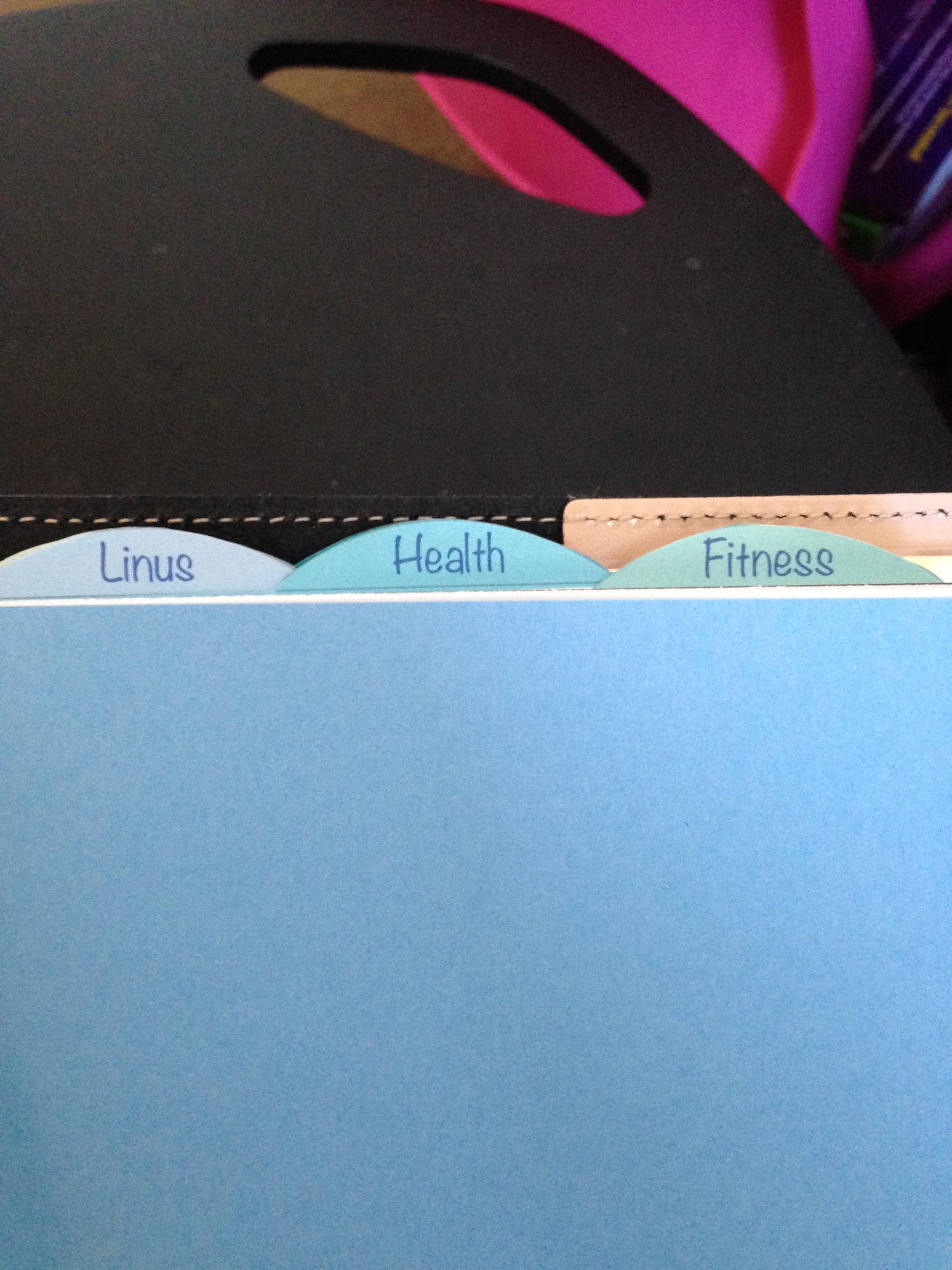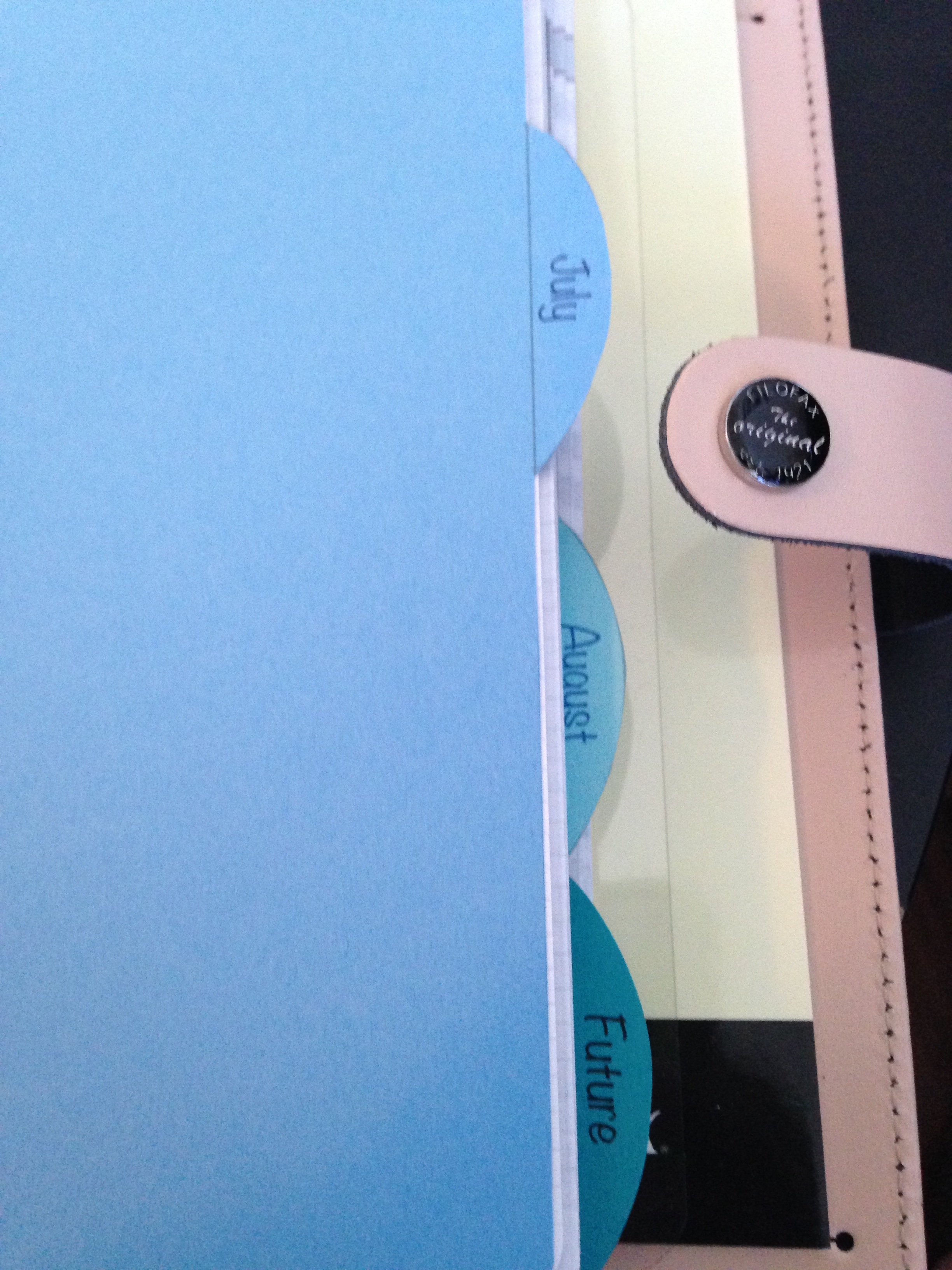I have tabs for June (almost over), July, August, Future, and one for each major area in my life that I absolutely have to sort out separately. In my old binder, I used to have a section for each person (husband, daughter) and pet. In this setup, I’ll be tracking their major events (health, birthdays, stuff I want to scrapbook later) using color coding (more on that later).