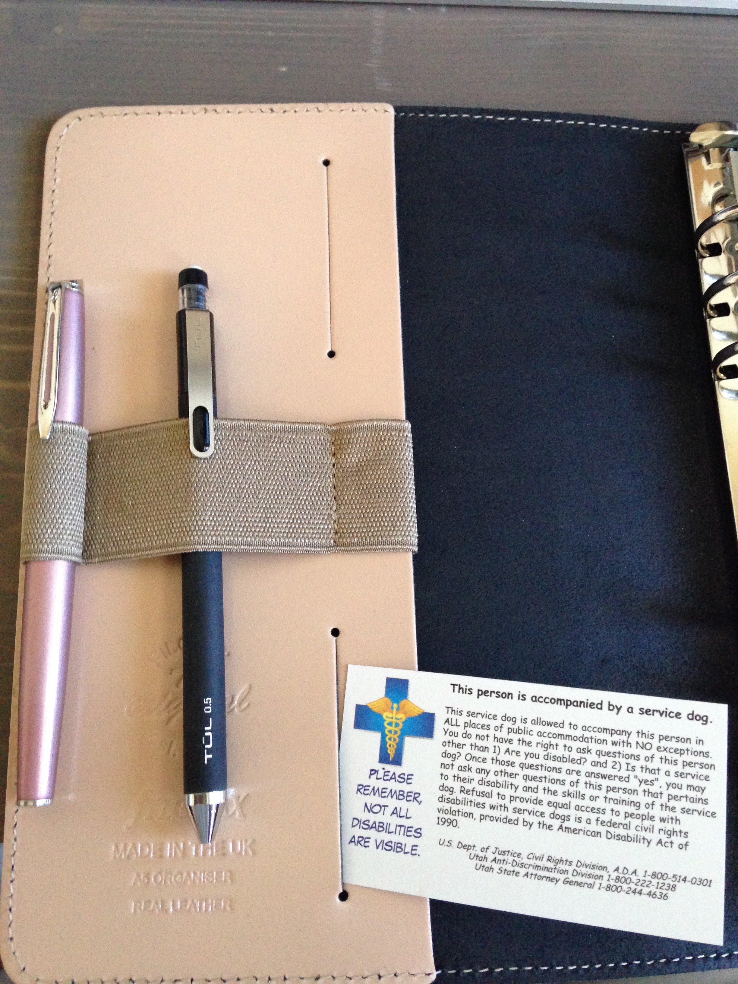 Inside front cover: I have a pen and pencil for general writing. I also have some ADA cards in the card slot for my service dog. I haven’t had to use these often but it does happen so it’s good to have them around, especially if I’m traveling or going to a store or building where they don’t already know me and my service dog.