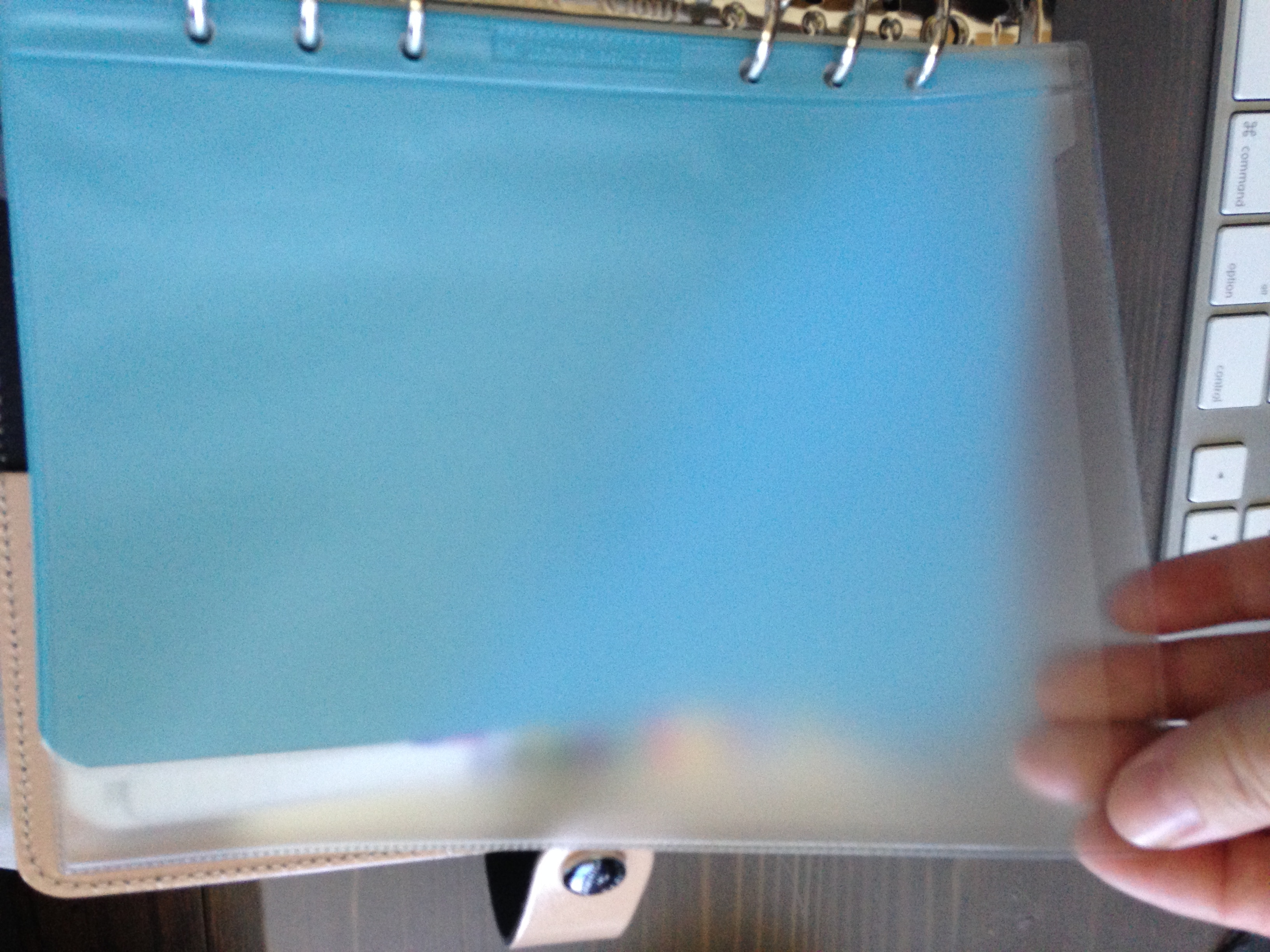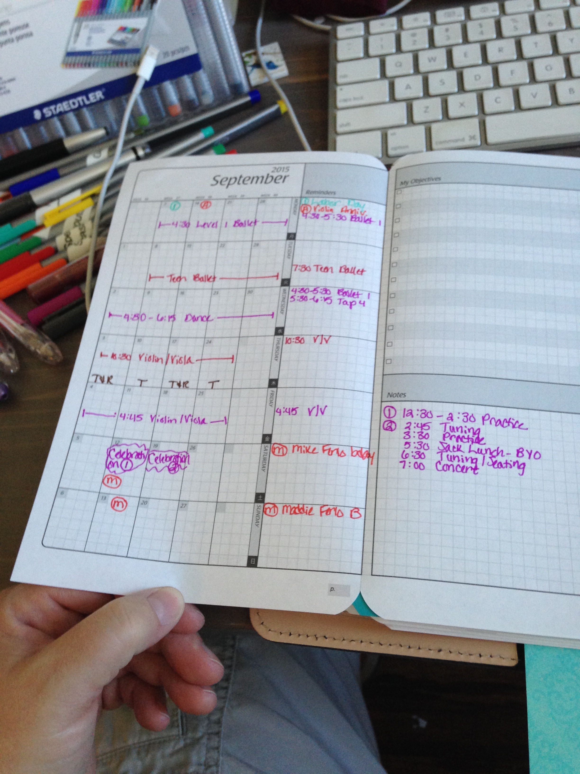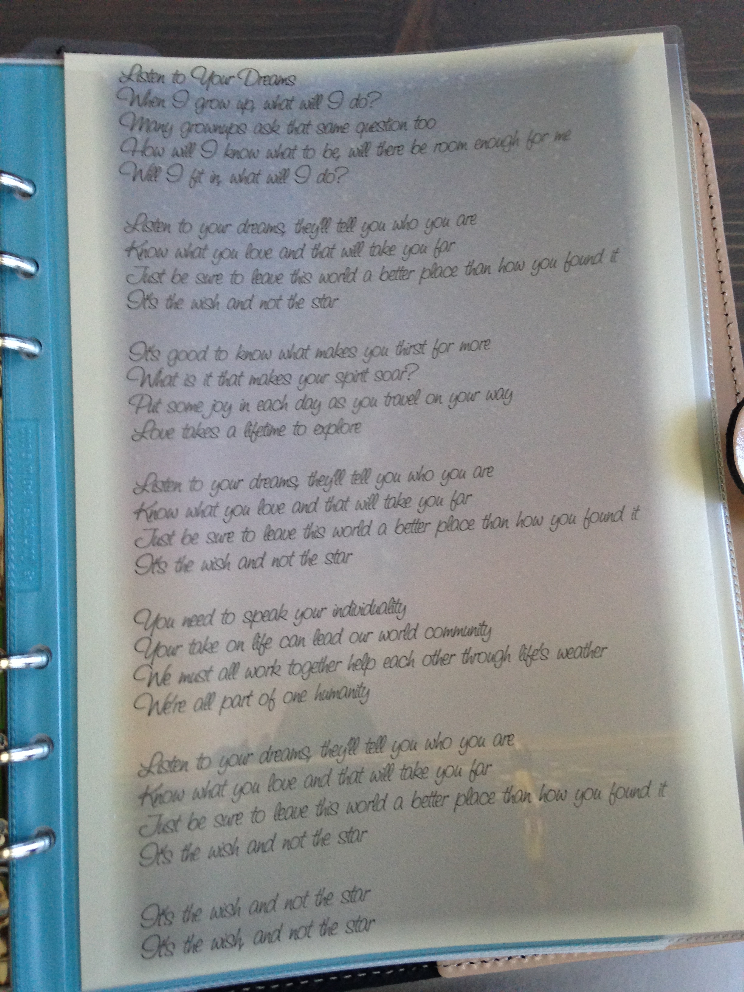 Filofax binders come with this cool document envelopes. They aren’t too stiff and are non-reflective. I slid a little motivational doohickey. The photo is of my favorite place outside of home, Cannon Beach in Oregon. Printed on top of that are some lyrics from a wonderful song by Susan Reed. These lyrics really spoke to me when she sang them at the Intermountain Suzuki String Institute this summer. You can find out more about her here, she’s amazing. Susan Reed