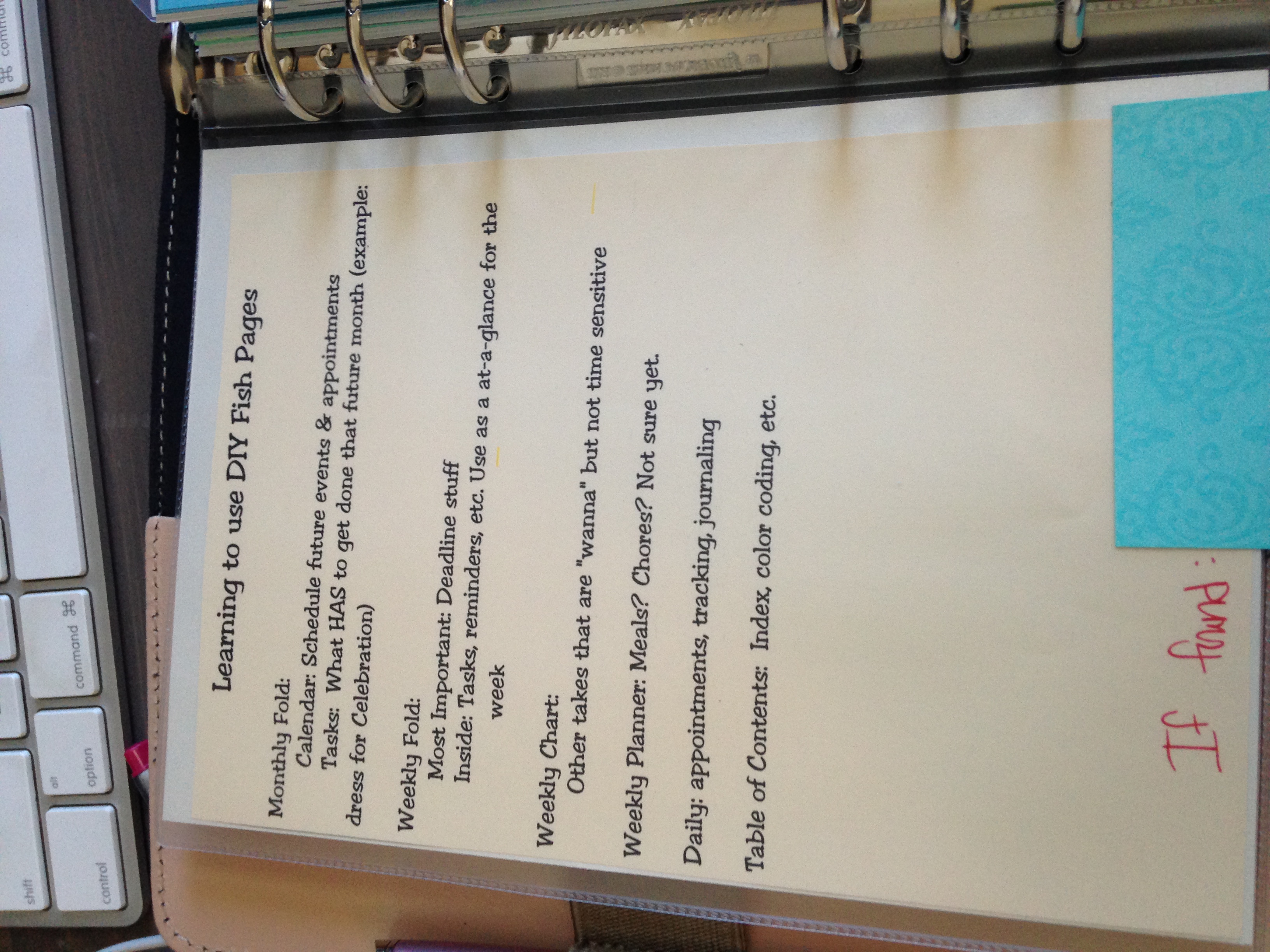 Since I’m new to these DIY Fish pages, I added a little reminder list for myself on how I’m planning to use the pages. I’ll eventually be able to get rid of the little paper but for the next month or so, it will probably be handy. I also added a phone number in case I leave my Filofax someplace accidentally.