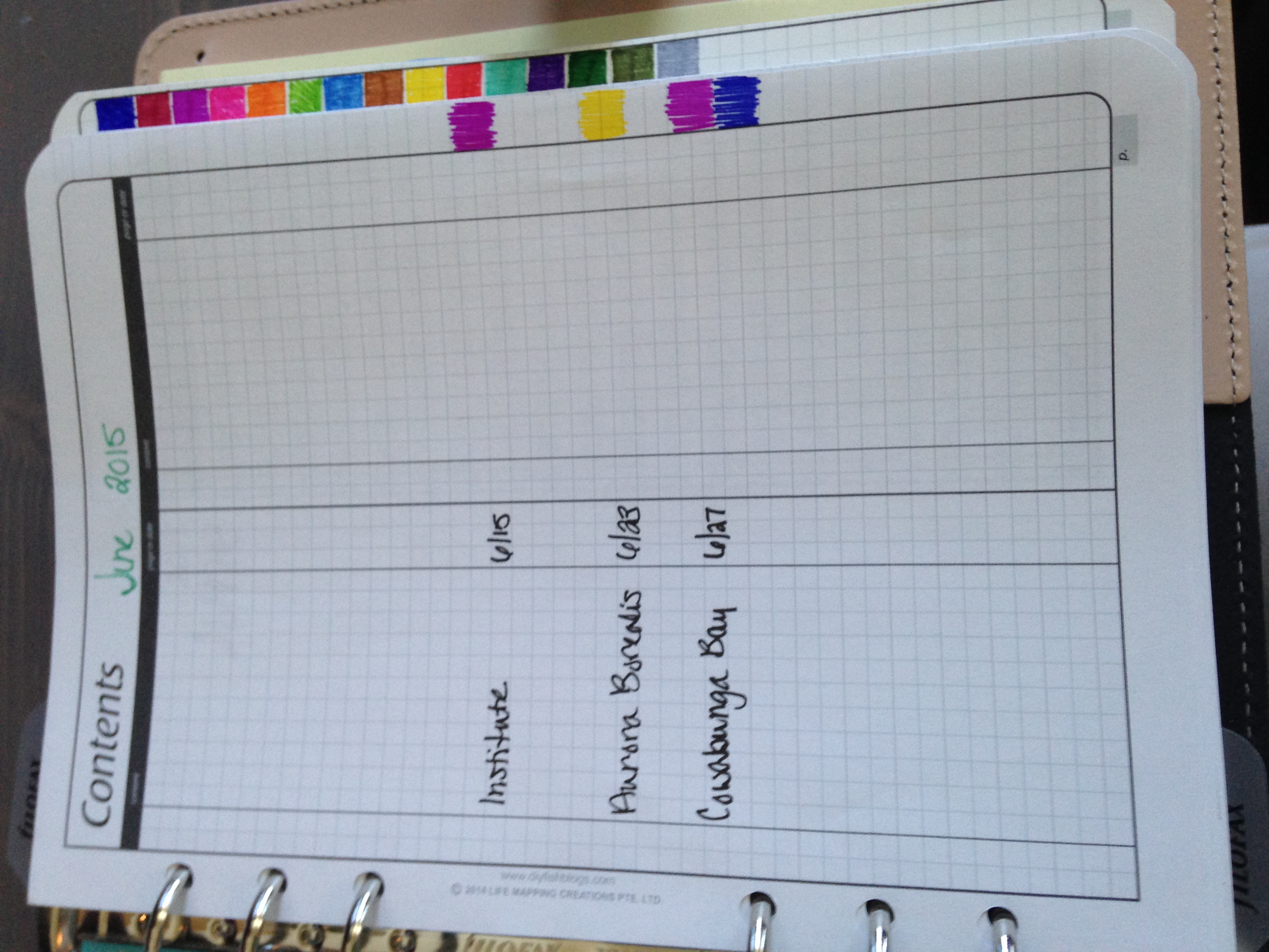 Behind that is my June contents page. On the side border I’ve color coded a few things I want to be searchable later on. More on color coding later. It’s a fabulous idea that DIY Fish came up with and I have a feeling it will save my mental health bacon in the future.