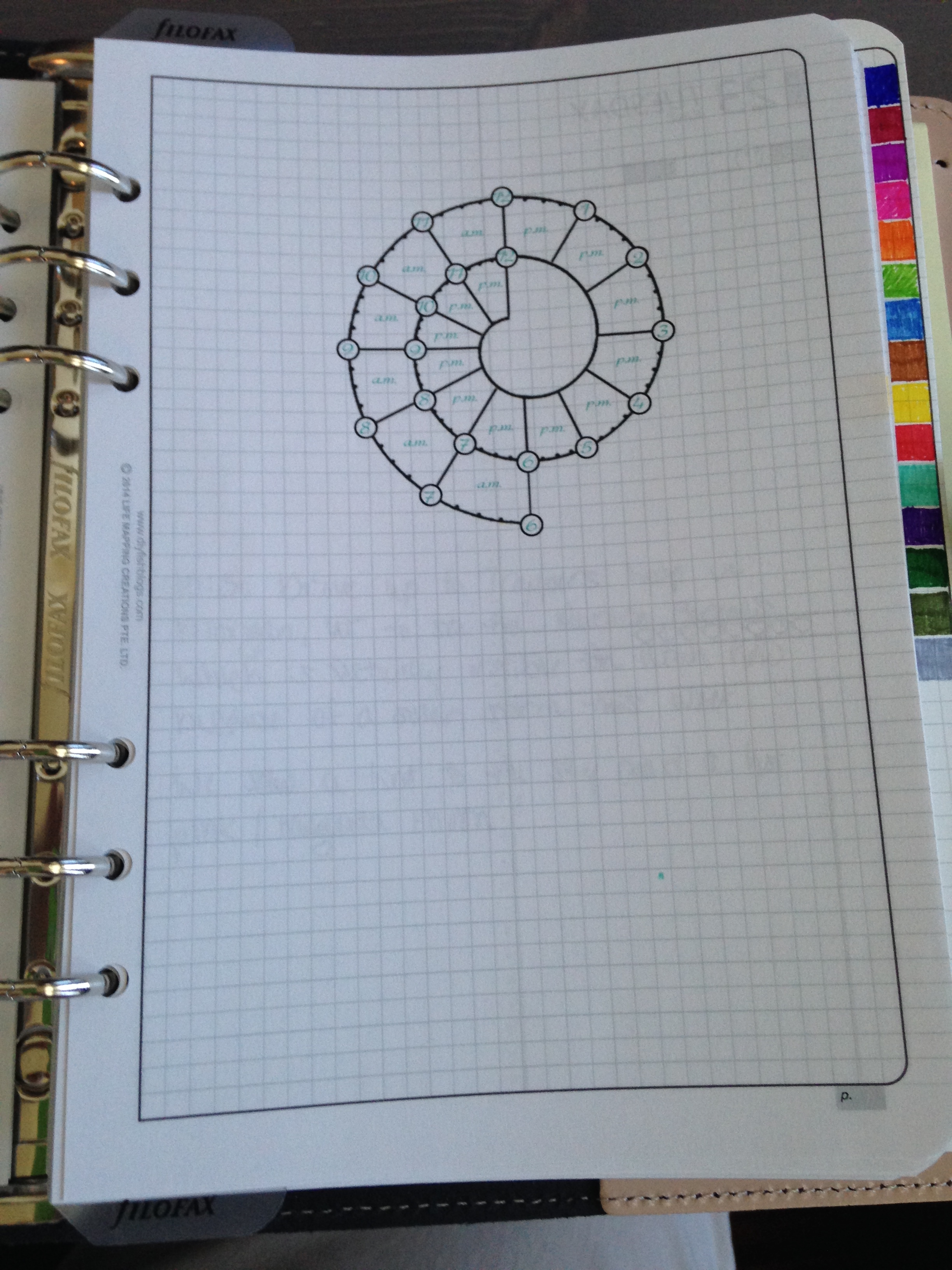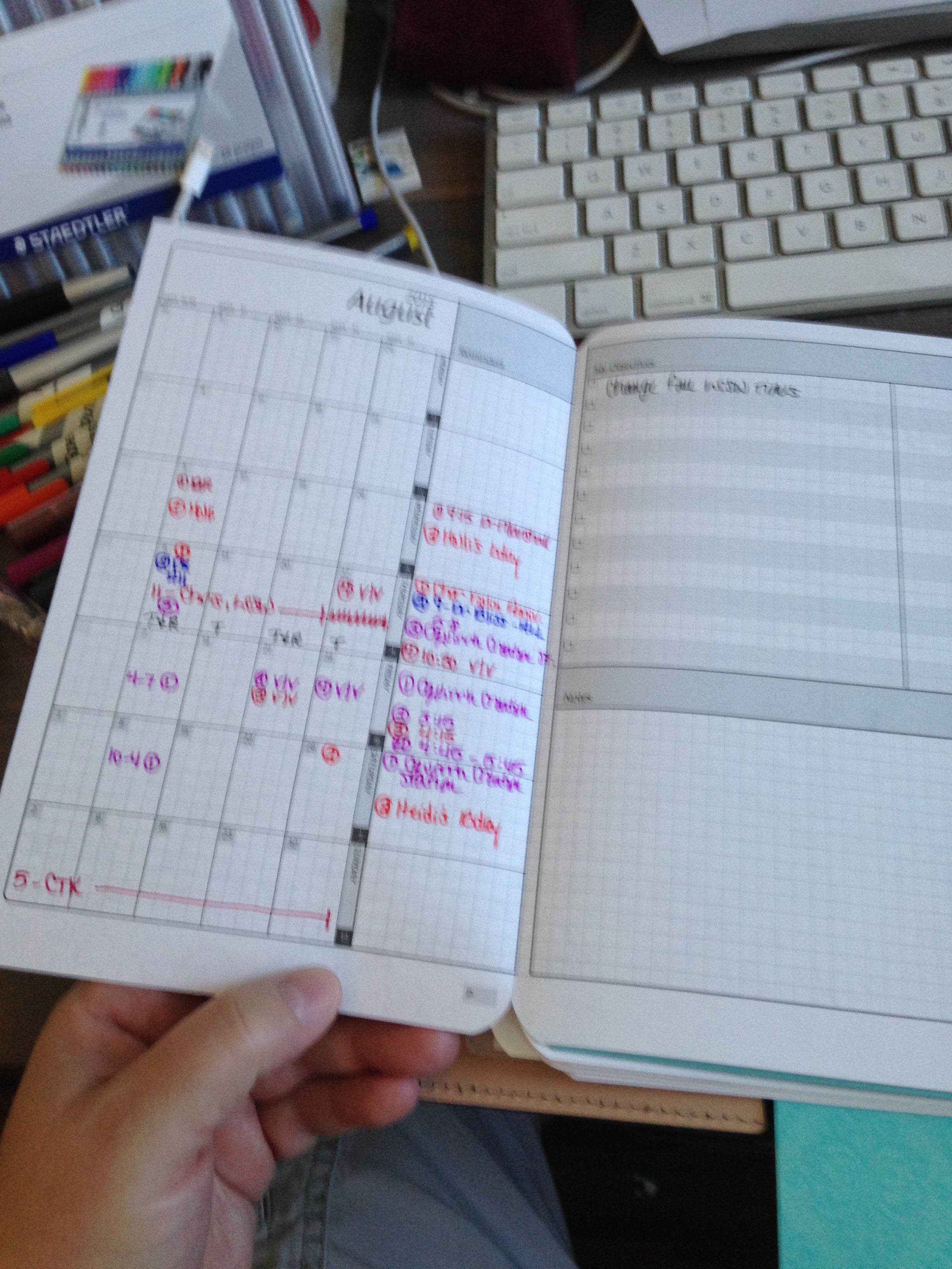 At the end of my month, behind the weekly and daily pages and sticking out on the side so I can see the colors easily, I have a color coding tab.
