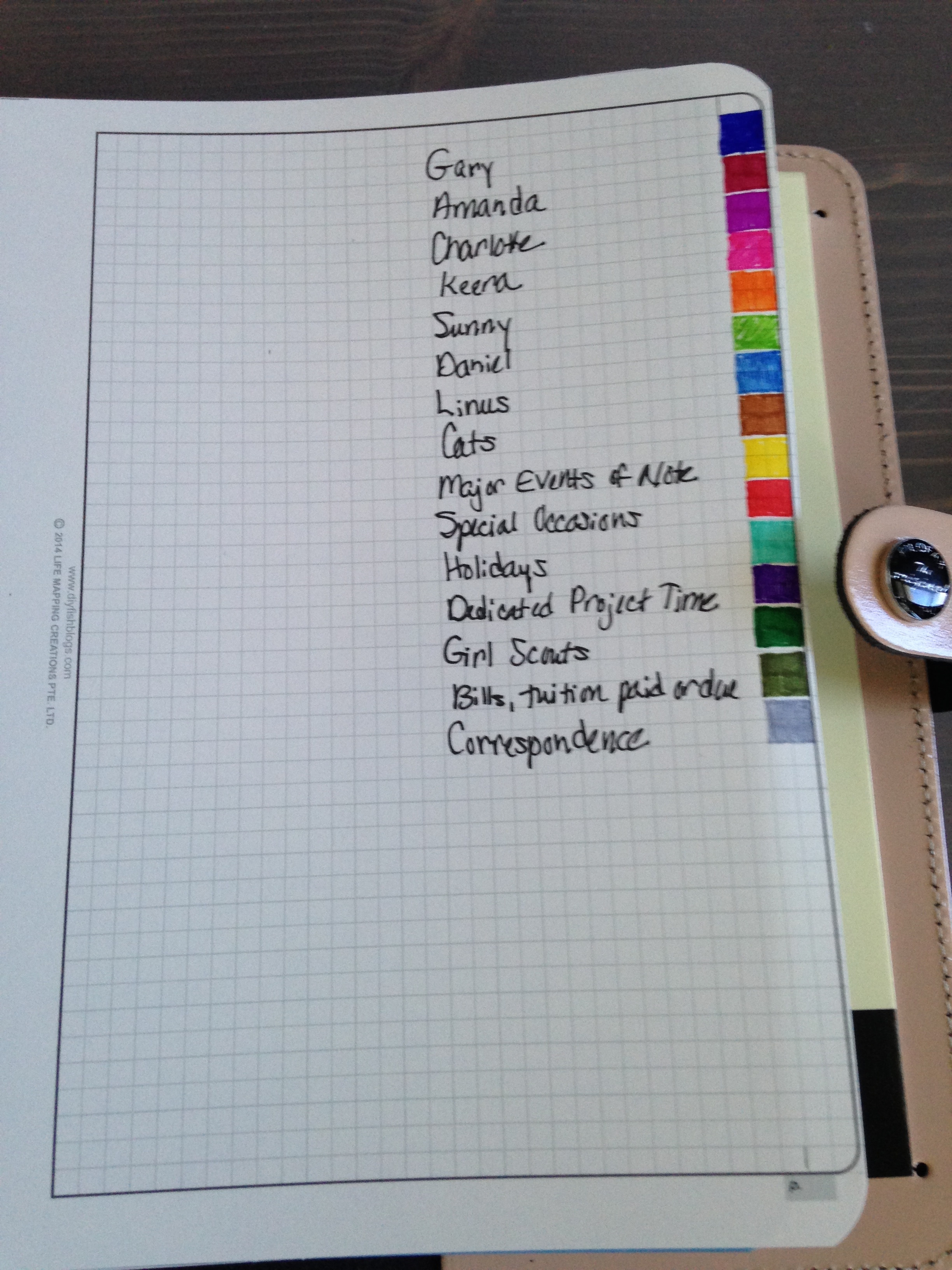 This is an absolutely ingenious idea that DIY Fish came up with for making written calendar items searchable. You assign a color to whatever item, person, type of appt., etc that you want to make searchable. Then when you need to find items of that color later on, simply slightly fan the pages of the book, archive, etc. and they jump right out at you! I love this idea. Because of my memory issues, I have a difficult time remembering if I finished a certain project, went to an appointment, or fulfilled an obligation. Now I can look that stuff up very easily. She makes her out of plastic and paper but I just cut mine out of cardstock a little wider than a normal Filofax a5 page. Her color coding system works no matter which combination of her pages you choose or what other inserts you stuff into your binder. Awesome! Here is her tutorial for making a color coding tab. Color Coding to Make Items Searchable